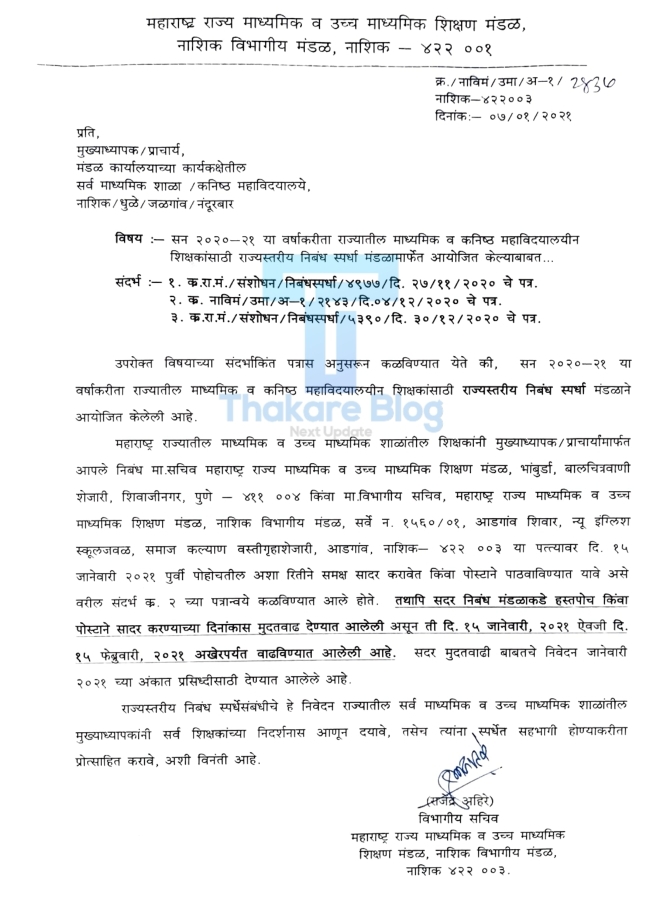 मुदतवाढ - राज्यातील माध्यमिक शाळा व कनिष्ठ महाविद्यालयातील शिक्षकांसाठी मंडळाने राज्यस्तरीय निबंध स्पर्धा